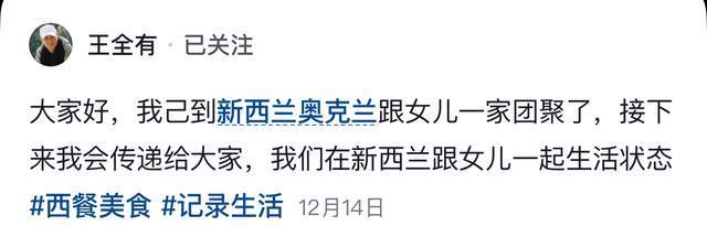 其实,关于此次新西兰之行,王全有早就表明过自己的态度,目的并不是去享受,而是因为思念女儿,所以在女儿放假期间,前往新西兰探望,如果是春节,那么女儿肯定还有工作忙碌。